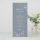 Vintage, boho, floral dusty blue wedding menu with elegant periwinkle and simple hand-lettered script.