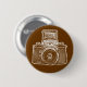A button badge with a high contrast, high passed filtered and vectorized image of a vintage East German camera from the 1950s. Creating a strong bold toothy retro screen print. or medieval Gothic brass rubbing like effect.