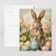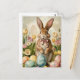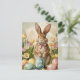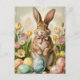 Celebrate the joy of spring with this charming vintage-style Easter illustration! Featuring an adorable, fluffy brown Easter bunny rabbit complete with a sweet pink bow tie, nestled amongst a vibrant garden of colorful tulips and spring flowers. Below the cute bunny sits a collection of beautifully decorated Easter eggs in lovely pastel shades, with one prominently wishing a "Happy Easter".