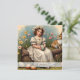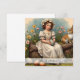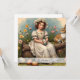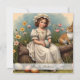 A young girl in an elegant vintage dress sits on a wooden log, holding a beautifully decorated Easter egg. Surrounded by blooming flowers and a curious rabbit, the scene exudes warmth, nostalgia, and the spirit of Easter.