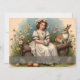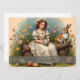 A young girl in an elegant vintage dress sits on a wooden log, holding a beautifully decorated Easter egg. Surrounded by blooming flowers and a curious rabbit, the scene exudes warmth, nostalgia, and the spirit of Easter.