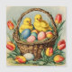 Cute old-fashioned yellow Easter chicks are sitting in an egg-filled basket with vibrant tulips all around. This square magnetic card provides just the right amount of nostalgia and fun for your customers this spring.