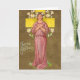 This pretty card features a vintage image of a woman in front of a cross, surrounded by Easter lilies. The text says "Easter Greetings".