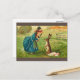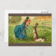 This adorable vintage style postcard shows a girl and a bunny interacting, along with an Easter greeting