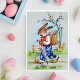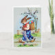 Share a vintage Easter greeting with this whimsical and cute Easter Greeting Card with a lovely illustration of the Easter Bunny bringing a basket of eggs with a blooming spring landscape in the background.