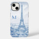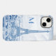 Personalize this iPhone 14 Case with your monogram right away. It includes a vintage blue Eiffel tower.