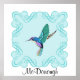 This elegant design has a light blue background with robin egg blue scroll designs creating a border. In the center is a handpainted hummingbird with a slight tribal look. The hummingbird is in teal, blue and purple. The overall effect has a vintage feel and would be great for your boho chic or shabby chic decor.