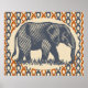 A fun vintage woodcut elephant poster featuring a mid-century background pattern of orange and gray ovals.