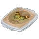 An enchanted green and gold butterfly lays in the center of a brown and gold ephemera panel with a distressed muted colors harlequin background. A lovely compact that can be personalized with name or mongram
