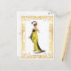 Enjoy this Art Deco inspired series of vintage fashion illustrations. This vintage fashion postcard features an early 1920s era evening gown in golden silk with trailing train and a feather headdress.