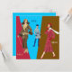 Unique invitation for a vintage fashion show. Front has three areas of old color - maroon, medium blue and warm brown. Three examples of fashions from the 20th century including ones from 1922, 1952, and 1968. The one from 1922 is a below the knee belted brown suit with accents in beige. The one from 1952 is a pleated red plaid below the knee dress with red gloves, shoes and hat.It is accented by a white scarf. The one from 1968 is a blue plaid above the knee coat dress with blue belt, gloves, stockings, shoes and hat.