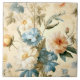 Vintage floral design in blues and golds including roses, daisies and various budding flowers drenched in nostalgia sunlight.