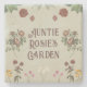 A vintage garden stone coaster display with floral elements and custom text, in muted green, red, pink, white and yellow colors.