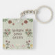 A vintage garden keychain with floral elements and custom text, in muted green, red, pink, white and yellow colors.