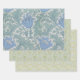 The three wrapping paper sheets have vintage floral Morris patterns with blue flowers and green leaves, by J.H. Dearle (1859-1932). The first pattern, "Anemone", from late 19th century, has big blue anemone flowers and big curved blueish green leaves. The other two patterns, "Harebell", from 1911 and "Michaelmas Daisy", from 1912, are smaller and symmetrical and have groups of small blue flowers and green leaves. All of them are in the public domain.