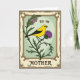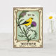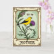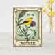 This card features a nature-themed illustration framed by an old-fashioned border that feels like a treasured botanical print. In the center, a bright yellow bird with black wing feathers and a dark, watchful eye perches on a thorny green stem, its tiny claws gripping just above a purple spiky flower. The cool mint-green background makes the yellow and purple stand out, while the bird’s slight tilt toward the bloom adds a tender, companionable mood ❤️. Around the scene, warm cream and deep brown tones form an ornate frame with curling flourishes and fine linework, like decorative engraving. The surface looks lightly textured, as if printed on fine paper with a gently aged finish. Near the top of the central panel, the small words “for my” appear in a dark ink, and near the bottom the larger word “MOTHER” is set in matching dark lettering, centered and easy to spot 🌼. The purple flower’s pointed petals radiate outward beneath the bird, set against the mint panel and enclosed by the cream-and-brown patterned border.