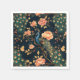 This elegant pattern features a vibrant blue peacock perched on a flowering branch, surrounded by large, soft pink and peach blossoms and detailed peacock feathers on a rich, dark teal background. The intricate details and vintage esthetic adds a touch of classic beauty and nature-inspired elegance.