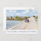 Vintage postcard image of Pigeon Key and the Overseas Highway in the Florida Keys shows a 1940s antique car crossing the seven mile bridge over Pigeon Key. Bright retro colors with the title in an art deco font makes a fun memento of old Florida.