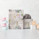 Repeating pattern on wrapping paper with a pretty collage of painted flowers and vintage postmarks with a black illustration of the eiffel tower. Charming and chic design.