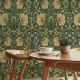 Elevate your interior decor with the timeless elegance of this vintage wallpaper, inspired by the iconic designs of William Morris. This beautiful pattern features majestic pimpernel flowers and delicate blossoms, intricately intertwined with lush green leaves and vines. The color palette includes soft pastel greens, warm yellows, and muted gold tones, all set against a deep forest green background. Perfect for adding a sense of classic sophistication and natural beauty to any room, this wallpaper seamlessly blends traditional charm with modern style, making it an ideal choice for creating a serene and elegant atmosphere in your home.