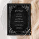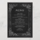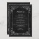 This elegant wedding menu features an ornate vintage silver frame on a distressed off-black background in imitation of an antique book cover. Customize the decorative silver gray text with your menu details. The frame design is repeated on the back of the card.