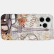 Is a vintage theme phone case taking place in Paris, France where there is a old car, the Eiffel Tower, flowers, a beret, and old cogs
