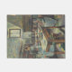 This design features a painting by the French Neo-Impressionist artist Maximilien Luce (1858–1941). It is a view of a traditional kitchen in a grand French house. There are two female culinary staff in the kitchen. One woman is seated as she cuts vegetables. The other woman is standing as she washes and dries plates. There is a large wooden table in the center of the kitchen, and there are many cabinets and utensils around the outside of the room. There is a small window in the corner of the kitchen, letting in light as the women work. The original art was painted in 1889.