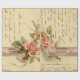 Vintage illustration of a glass vase wrapped in a silk pink ribbon and filled with pink tea roses. Handwriting in the background and along the edges.