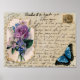 An antique, hand written french postcard makes a wonderful backdrop for the bouquet of flowers and blue butterfly in the corner.