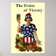 Our vintage World War I poster was created around 1919 to encourage women to save food by growing their own crops and preserving and canning their fruit and vegetable harvest at home. Called The Fruits of Victory, the poster was produced for the National War Garden Commission and published by F.M. Lupton, Publisher, Inc. By artist Leonebel Jacobs, the painting shows a brave and noble looking young woman dressed in stars and stripes holding a glass jar of pickled green vegetables aloft in one hand while with the other she points to a feast of vegetables, fruit and jars of preserved food. There are apples, pears, tomatoes, sweetcorn and all sorts of tasty foods in front of her. You can add your own color background to suit your décor, and add a color border simply by using the customize button.
