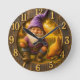 Rustic farmhouse clock featuring a classic purple garden gnome with a golden hen in sunny countryside. Wooden round clock with distressed finish and gold numerals—perfect farm decor for kitchen or gift