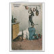 A vintage German illustration depicts a comical scene in a butcher shop with the butcher and his two Dachshunds. The dogs must have been plotting together to figure out how to reach the sausages hanging from a rack. One Dachshund has convinced the butcher that there's something under a cabinet. The dog has its head and shoulders under the cabinet and the butcher has knelt down to the floor to look under too, his rear sticking up in the air. In the meantime, the other wiley Dachshund jumps onto the butcher's rear end, stands on its hind legs, and can now reach and grab that tasty sausage hanging above. The butcher has been outwitted! In German, this text appears in the upper left of the illustration, "Ein abgeteimtes Dacelpaar." This card is blank inside for your own message.