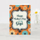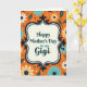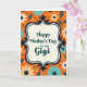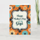 This card features a lively orange background filled with scattered floral and leafy shapes that feel like a cheerful garden around a loved one ❤️. In the middle sits a cream-colored panel, giving the design a cozy focal point like a note set aside just for her. A deep navy, curving border frames that panel, decorated with tiny white dash marks and curled flourishes that add a vintage touch. Centered inside, the text reads “Happy Mother’s Day to my Gigi,” written in flowing deep teal lettering that stands out clearly against the cream. The flowers around the panel appear in pale yellow, crisp white, and light aqua blue, each with a deep navy center that echoes the frame. Small blue and white dots are sprinkled between the blooms, like little confetti that suggests a warm, affectionate closeness 🌼. The overall layout keeps the message centered while the orange field and repeating botanicals wrap the edges in pale yellow petals, white blossoms, aqua leaves, and navy accents.