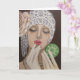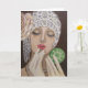 Original acrylic painting of a vintage and glamorous lady........A great capture of a vintage woman applying lipstick and primping herself up. She is lavishly dressed and beautiful to look at. A great note card to send to friends and family for whatever you choose to express. Blank on the inside so you can write your own personal sentiments.