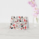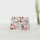 A notecard with a retro inspired red and black pattern of cooking supplies. Pattern features illustrations of a mixer, stove, whisk, spatula, rolling pin, oven mitt, and cherries.