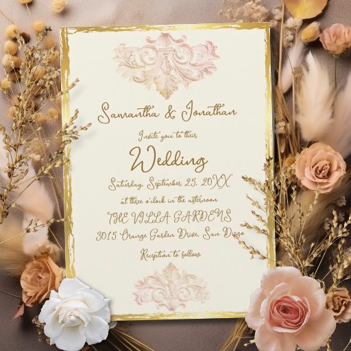 Vintage Gold Baroque Wedding Elegance brings regal beauty and timeless sophistication to your wedding stationery. The main feature of this vintage gold baroque wedding invitation is its luxurious blend of ornate baroque scrollwork, gilded brushstroke borders, and subtle blush accents—printed on textured ivory cardstock for a rich, heirloom feel.