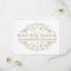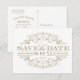 This beautifully styled save the date postcard features a clean white background with antique gold ornate scrollwork flourishes in an intricate filigree frame. The bold mixed serif typography displays the couple's names and wedding date with timeless elegance. All text is fully customizable, and the mailable postcard reverse includes address fields. A classic and versatile design that coordinates beautifully with any gold wedding suite.
