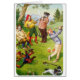 A vintage illustration of a group of cats on the golf course, dressed in golf attire, and having the time of their lives. One cat takes a swing with his golf club, knocking over the caddy and scaring off a dog who goes running from the scene. The card is blank inside for your own message.