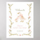 This baby shower welcome board design features a cute little goose and her mama, and a whimsical watercolor greenery frame design with pink floral elements.