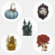 "Bring a touch of vintage gothic charm to your Halloween projects with this set of 5 spooky stickers. Featuring a whimsical blue pumpkin, haunted castle, gothic lantern, red skull rose, and a creepy framed skull, these designs are perfect for decorating Halloween gift bags, party favors, journals, scrapbooking, or seasonal crafts. Ideal for both kids and adults who love a mix of creepy and elegant Halloween style."