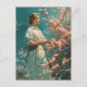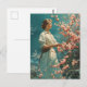 The postcard features a timeless scene with a woman standing gracefully beside a petite cherry blossom tree. Her attire reflects the era's elegance, and the delicate pink blossoms create a serene backdrop, capturing the essence of a bygone era.