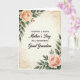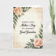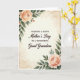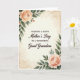 On the front of the card, a warm, vintage-style background sets a gentle, affectionate tone, like a treasured note kept in a drawer. Centered text reads “WISHING A HAPPY Mother’s Day TO A WONDERFUL Great Grandma,” arranged in stacked lines with the main words in dark lettering that stands out clearly against the creamy paper. The lettering mixes a classic serif look with smoother flowing letterforms, giving the message a soft, caring feel without crowding the space. In the corners, watercolor-like floral clusters bloom in peach and apricot shades, with tender petal layers that suggest a loving touch ❤️. Green leaves and thin stems curl around the flowers, framing the words the way a bouquet might be held close in a fond embrace. Subtle, diffused lighting and faint mottled marks across the background add an aged-paper character, like something lovingly saved and reread 🌼. The edges look gently worn, with light distressing and soft stains that fade into the cream backdrop.