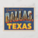 This is a classic vintage-style postcard featuring the phrase "Greetings from Dallas, Texas." The large, stylized letters of DALLAS each contain a unique scene or landmark from the city, including its impressive downtown skyline. The design has a nostalgic, mid-century feel with its retro color palette and bold font, making it perfect for products like postcards, posters, and t-shirts for anyone who loves vintage travel art or the vibrant city of Dallas.