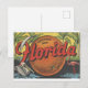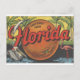 Greetings from Florida vintage reproduction postcard, probably from the 1940s, features a huge orange in the middle, a flamingo, a pelican, and a fish with a background of palm trees. Very colorful lithograph.