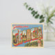 This is a classic vintage-style postcard featuring the phrase "Greetings from Georgia" in large, stylized letters. Each letter of GEORGIA contains a unique scene or landmark from the state, including the state capitol, landscapes, and a peach orchard, with a woman harvesting peaches. The design has a nostalgic, mid-century feel with its retro color palette and bold font, making it perfect for products like postcards, posters, and t-shirts for anyone who loves vintage travel art or the beautiful state of Georgia.
