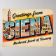 Capture the medieval charm of Siena with this retro postcard-style illustration. “SIENA” appears in uppercase letters filled with miniature images of Piazza del Campo, Torre del Mangia, Siena Cathedral, and Palio horse race scenes. Behind the text, the bustling piazza and historic buildings are rendered in vivid vintage colors. Ideal as a wall poster gift for Tuscany lovers.