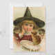 Flat card featuring a Vintage Halloween cutie in large pointed hat with kittens and some milk .Courtesy of The Graphics Fairy -edited by Alma Wad .