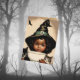 Vintage Halloween cutie in large pointed hat with two kittens "Witching you a very haunted Halloween!" is a funny quote inside the card with an old textile-looking background. Great for anyone who loves vintage images, witches, cats, and word plays.No5 version features a cute African American child .