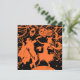 A cute, vintage, Halloween, black and orange illustration, of a women, and a man, dressed as a devil, and a witch, with Jack o' Lantern and decoration hanging everywhere. Very simple, and charming. Great for Halloween parties, and those who love vintage art, and the colors black and orange.