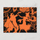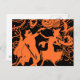 A cute, vintage, Halloween, black and orange illustration, of a women, and a man, dressed as a devil, and a witch, with Jack o' Lantern and decoration hanging everywhere. Very simple, and charming. Great for Halloween parties, and those who love vintage art, and the colors black and orange.